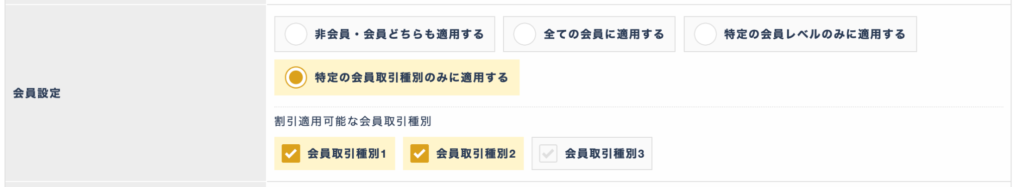 特定の会員取引種別のみに適用する | 会員取引種別機能をご利用の場合のみ設定可能。 指定した会員取引種別(複数選択可)の会員がログインしている場合に割引を適用する。非会員、会員で未ログイン、指定の会員取引種別に属さない会員でログインしている場合は割引は適用されない。 |
