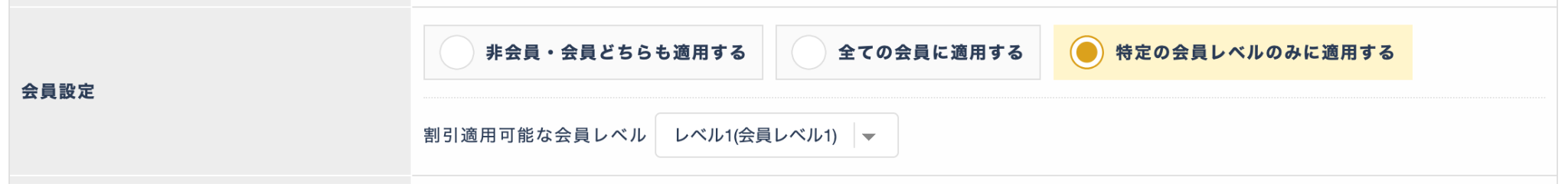 特定の会員レベルのみに適用する | 指定した会員レベルの会員がログインしている場合に割引を適用する。非会員、会員で未ログイン、異なる会員レベルの会員でログインしている場合は割引は適用されない。 |