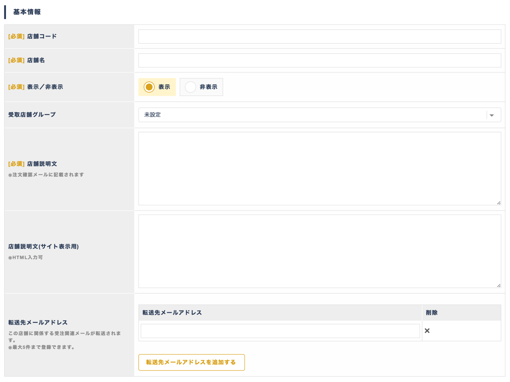 転送先メールアドレス | 受取店舗の転送先メールアドレスを設定する。(最大5件まで登録可能) 受注関連メール転送設定をご利用中の場合は、受注の受取店舗に設定された転送先メールアドレス宛てにも受注関連メールが自動で送信されます。 受注関連メール転送設定の詳細については、>>「受注管理_受注関連メールシステム設定」もご参照ください。 |