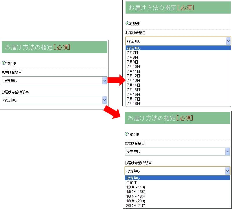 食品・ギフト向け機能をご利用時は、カートページ内に表示される宅配便の「お届け希望日」「お届け希望時間帯」の選択肢表示が異なります。