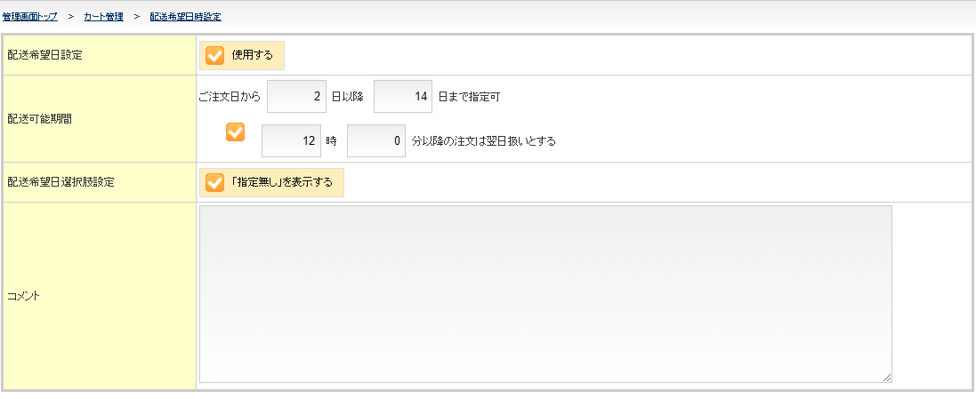 指定時間以降は翌日扱いにする設定、お届け希望日・お届け希望時間帯を選択する箇所に表示するコメントの設定もできます。