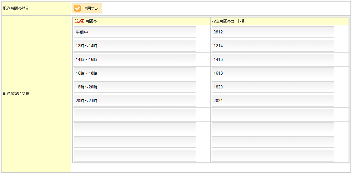 配送希望時間帯 | 時間帯:お届け希望時間帯の選択肢を設定。 指定時間帯コード欄:他社形式CSVの各配送会社の時間帯に相当する箇所に設定したコードを出力。 |