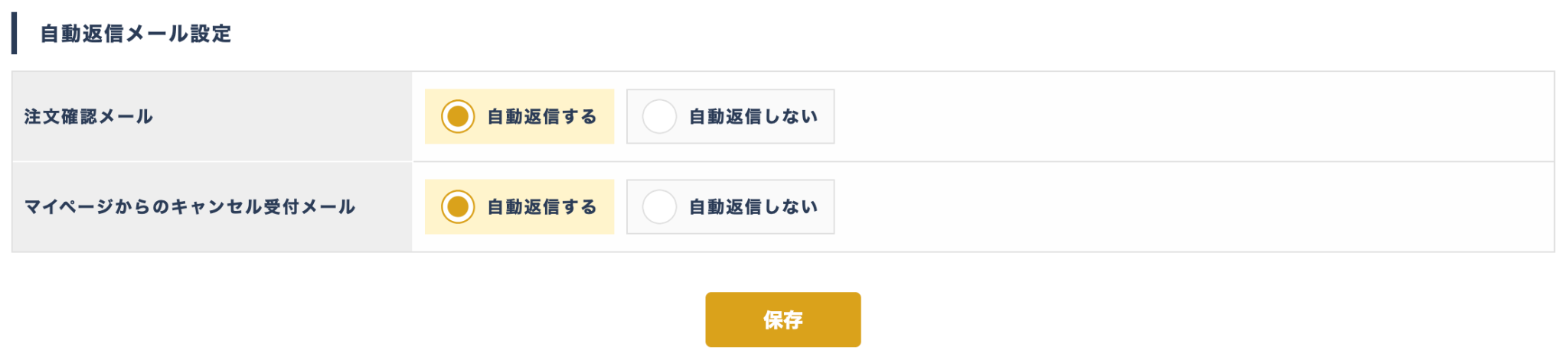 マイページからのキャンセル受付メール | マイページで注文キャンセルを実行時に注文者に注文キャンセルメールを自動返信するかどうかを設定する |