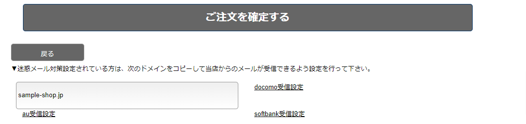 許可ドメインを指定すると、カートの注文確認ページの下部に受信許可設定のご案内文が表示されます。(図.カートページ表示例)