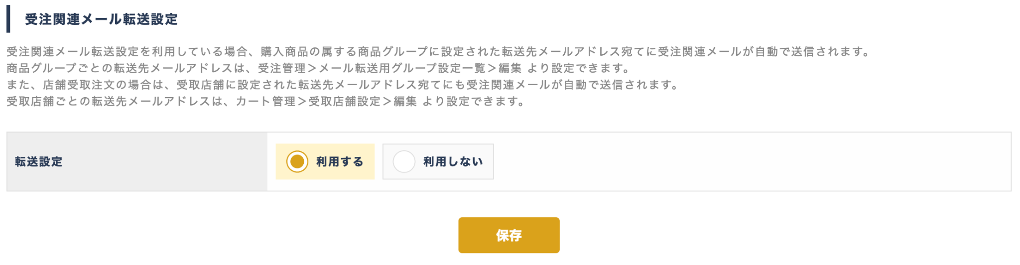 転送設定 | 受注関連メール転送設定を利用するかどうかを設定する |