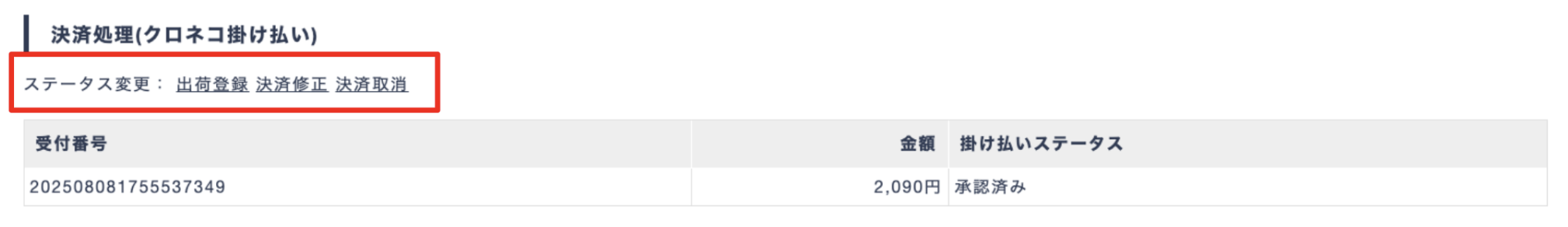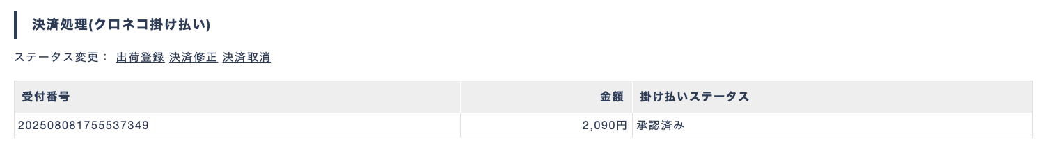 注文時のお支払い方法にクロネコ掛け払いを選択した場合の受注詳細画面の決済情報欄の表示と操作について解説します。