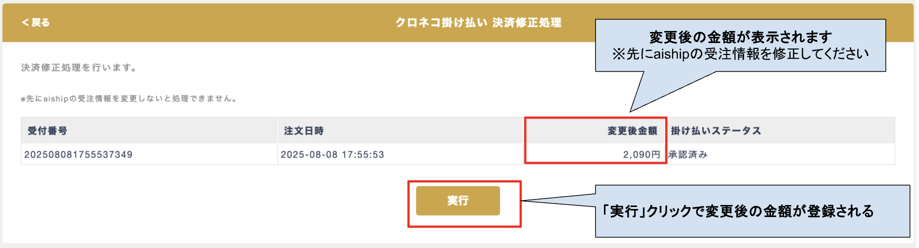 決済修正は、クロネコ掛け払いサービスに連携済みの金額を変更する操作です。「決済修正」リンクをクリックすると、決済修正処理の実行画面へ遷移します(「図.決済修正実行画面」参照)。「実行」ボタンをクリックすると、変更後の金額がクロネコ掛け払いサービスに連携されます。尚、決済修正を行う前に、あらかじめ受注詳細画面の明細情報タブより金額の変更を行う必要があります。