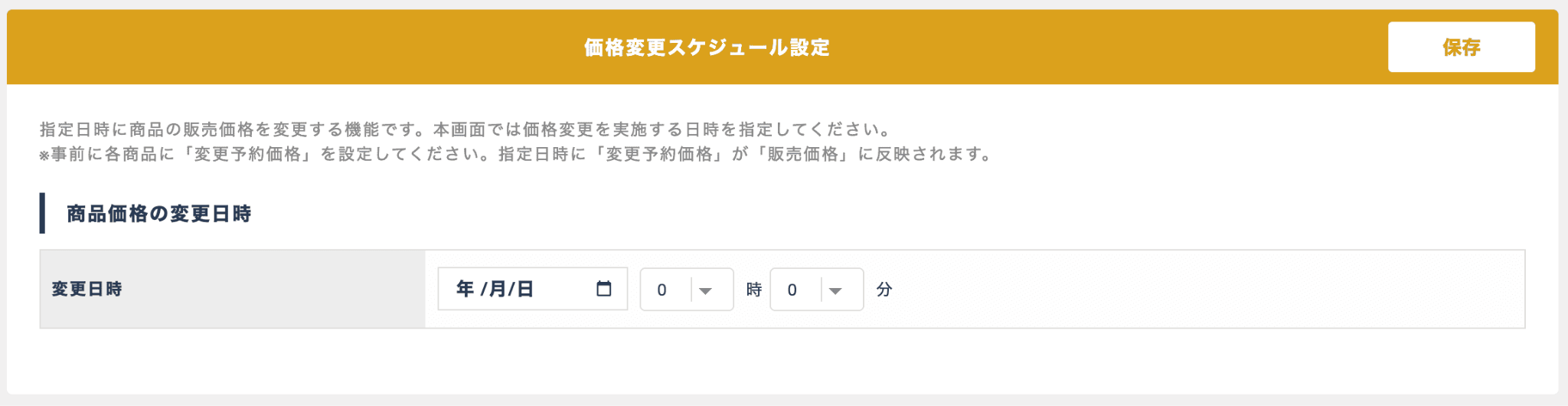 本画面では、商品価格の変更日時を設定します。あらかじめ各商品に「変更予約価格」を登録しておくことで、指定した日時に自動で商品価格が更新されます。「変更予約価格」の登録方法については、3.関連記事 のマニュアルをご参照ください。