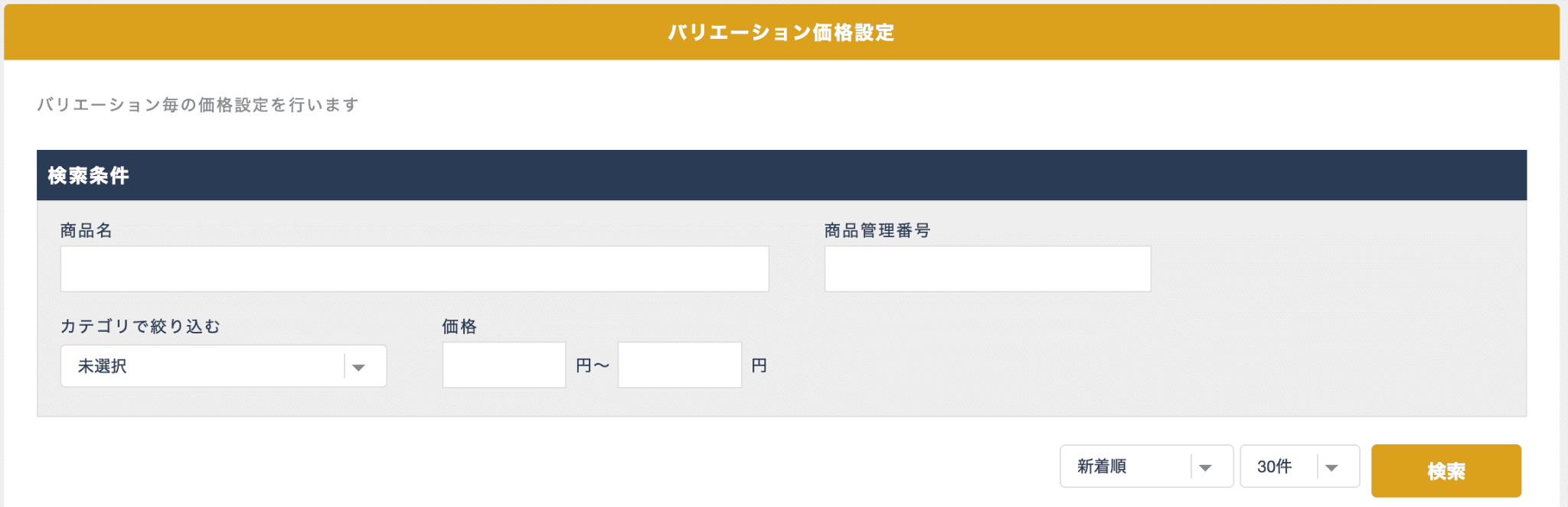 商品の検索エリアでは、バリエーション価格を設定する商品を絞り込みための検索条件の指定と1ページ当たりの表示件数の指定を行います。検索条件と表示件数を指定して検索すると、条件に一致した商品が指定した表示件数ごとに表示されます。