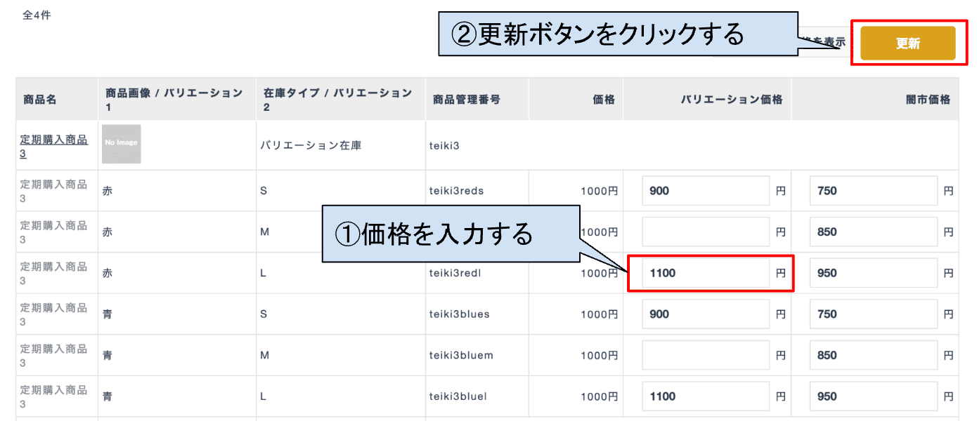 登録商品編集画面で「バリエーション毎の販売価格を適用する」を設定している商品の場合は、本画面で設定した価格が適用されます。