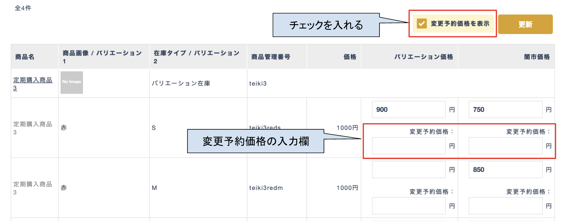 「変更予約価格を表示」にチェックを入れると、変更予約価格の設定欄が表示されます。変更予約価格を設定する場合は、入力欄に値を入力し、一覧上部の「更新」ボタンをクリックすると更新されます。
